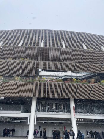 寒いけど気持ちいいです。周りはかなり早いペースです。そのペースに引きずられて自分のペースも自然と上がります。駐車場をまわります。ここは殺風景です。ですが競技場に入る瞬間の風景ときたら! 高揚感がすごいです! オリンピックでマラソンに出場したらこんな風景が待っているんだ! という気分になります。