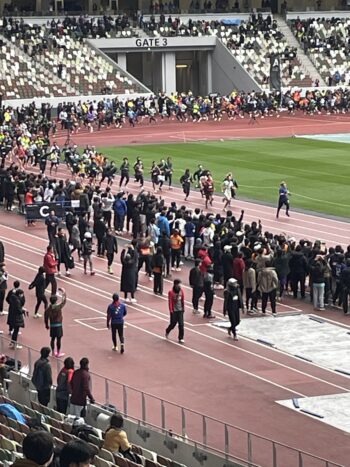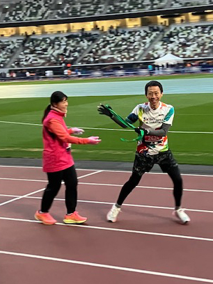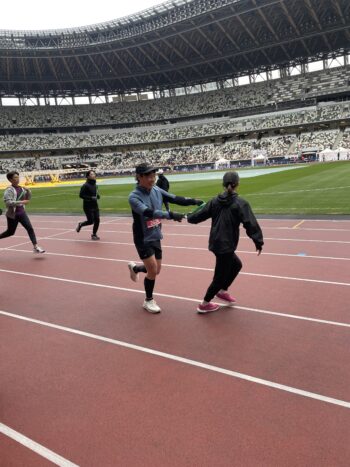ルールは国立競技場内の400mトラックをまず1/4周走り、競技場を出て観客席の下にある駐車場をぐるっと回り、それから競技場に戻り400mトラックを3/4周走ってタスキを繋ぐ、1.4キロのコースです。それを複数人でタスキを繋いで42キロを走ります。1周ごとにタスキを渡しても、何周走ってタスキを繋いでもよく、制限時間は4時間です。チームの作戦力が試されます。