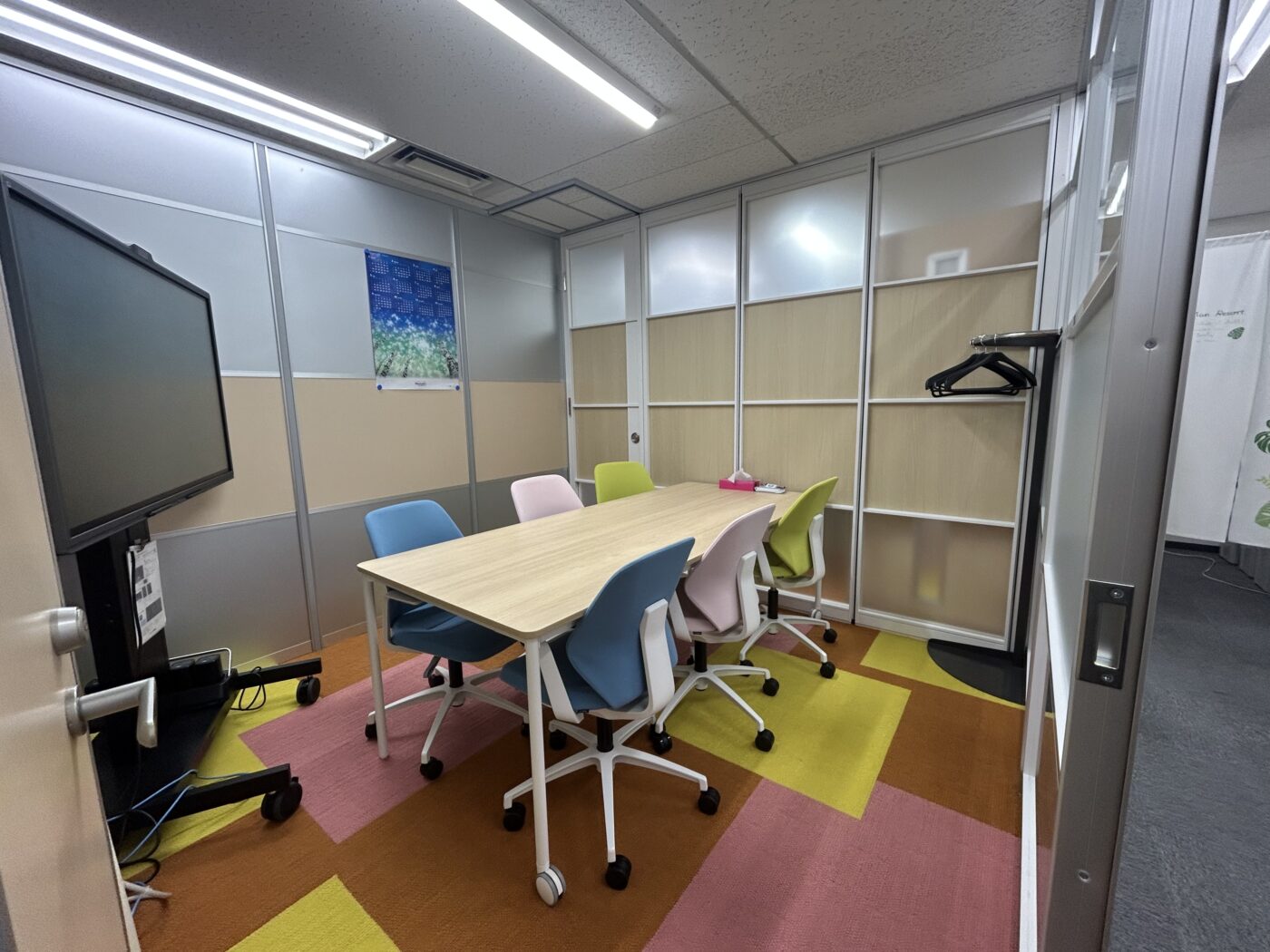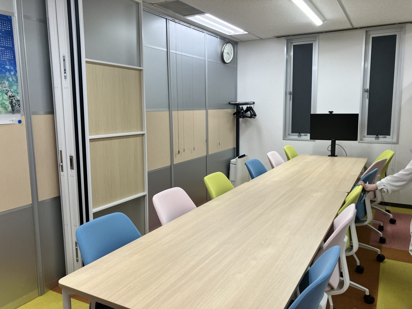 News 会議室リニューアルのお知らせ 2025.10.28 会議室をリニューアルしました! 2室間の間仕切りを可動間仕切りに変更し、1室の大きな会議室空間として利用できるようにいたしました。 それに併せて、床のマットもカラフルになりました!