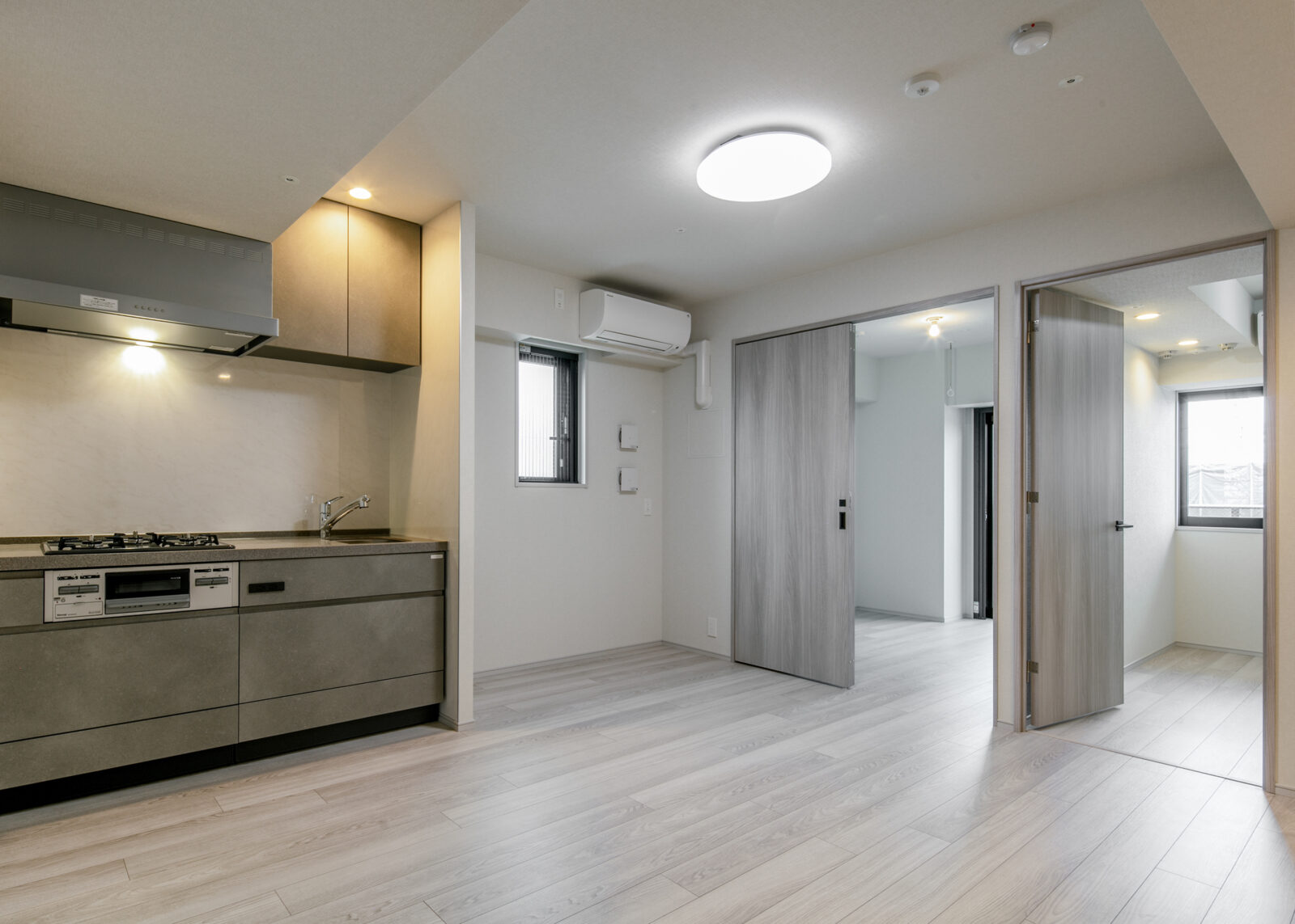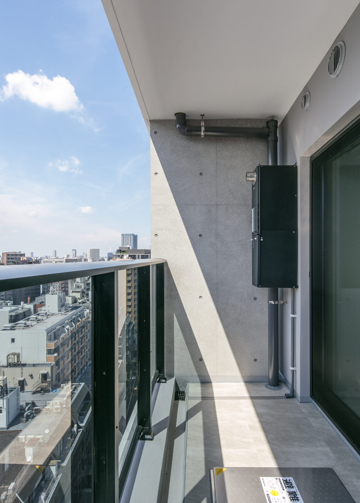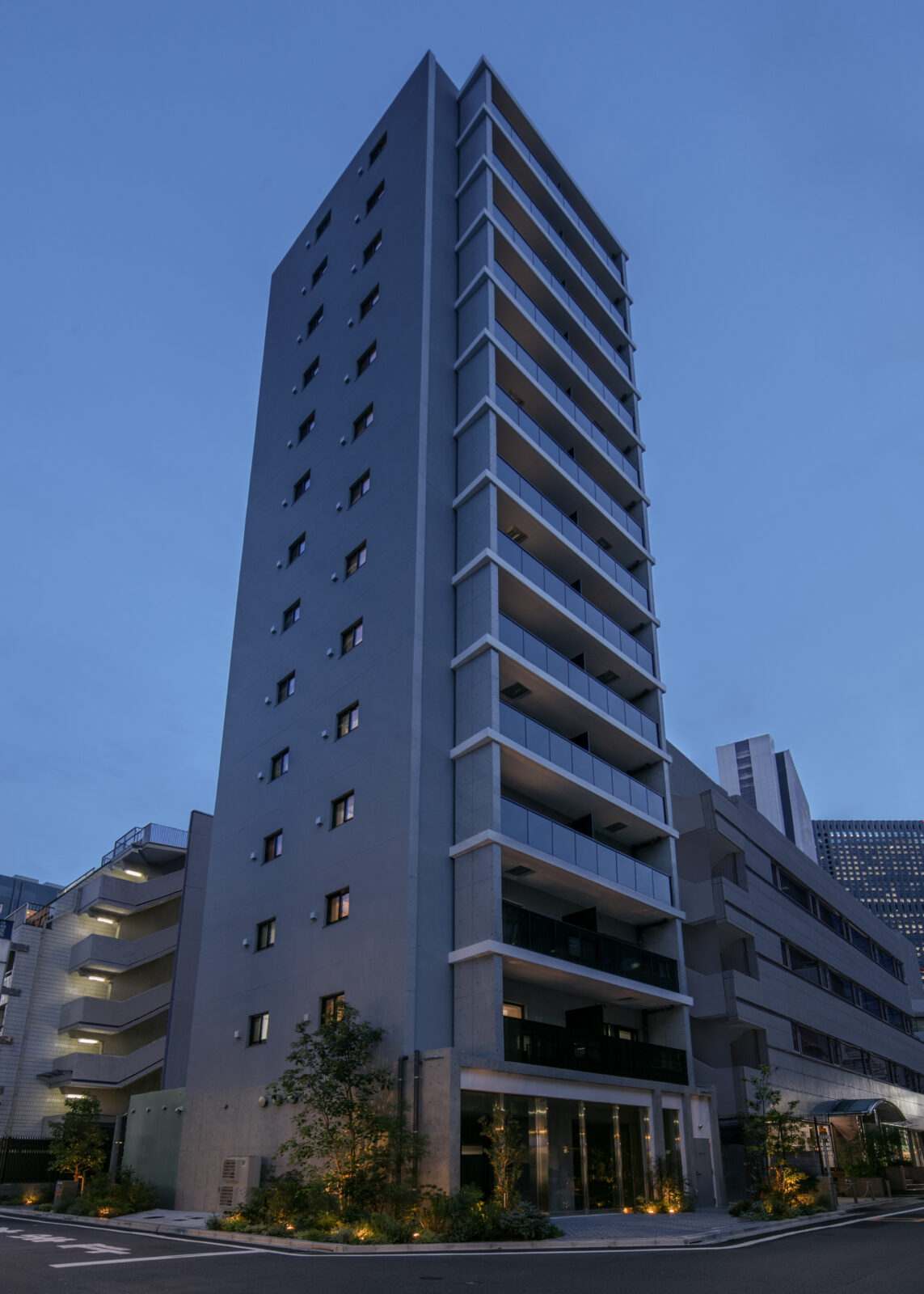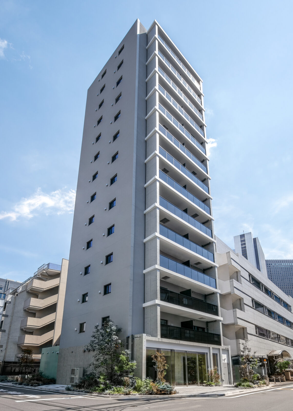 住戸をコンパクトにまとめることで、各戸の採光・通風性能を高め、都市生活における快適性と合理性を両立させています。西新宿7丁目の高密度で雑多な都市環境においても静けさを内包する集合住宅の外観を形成しました。