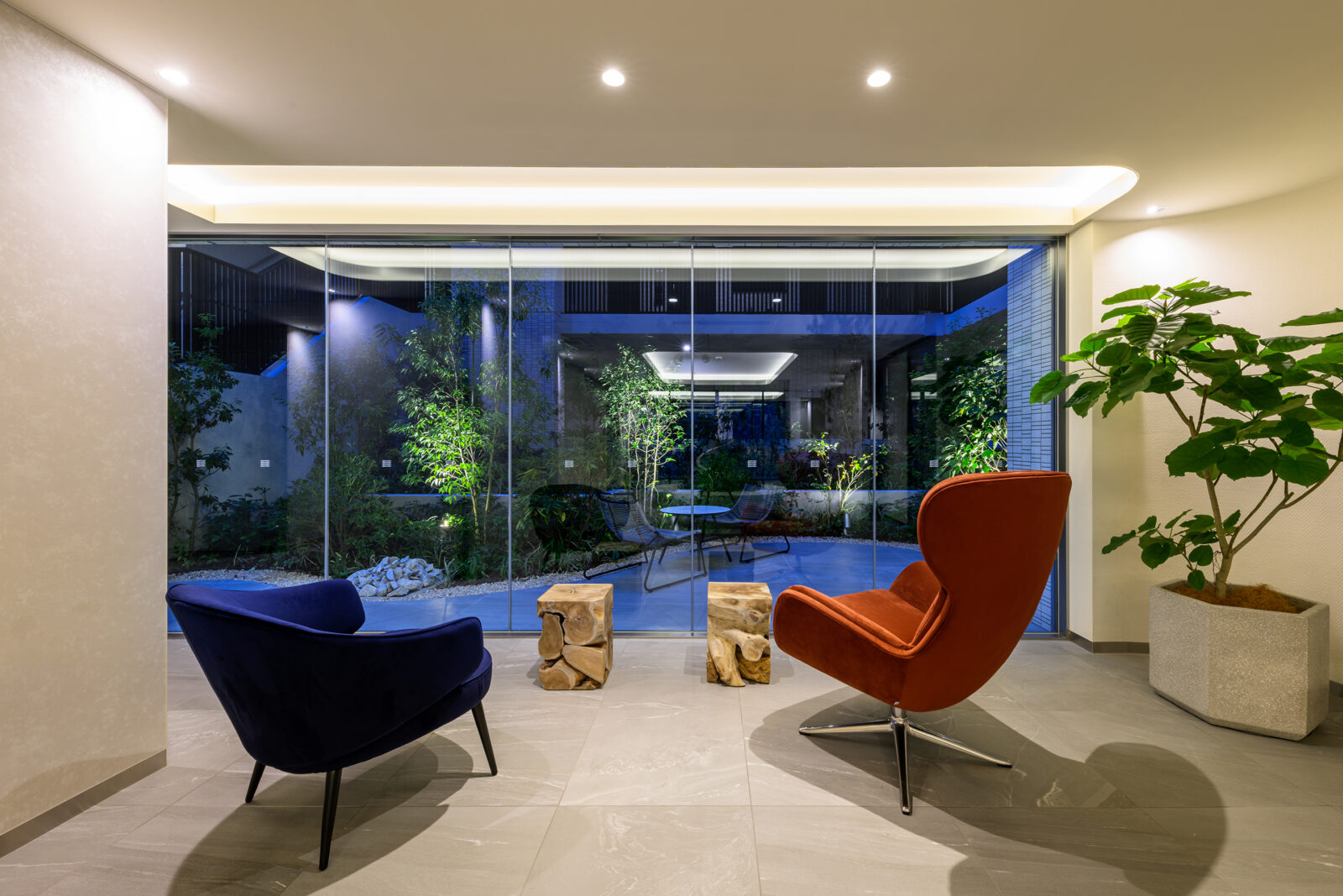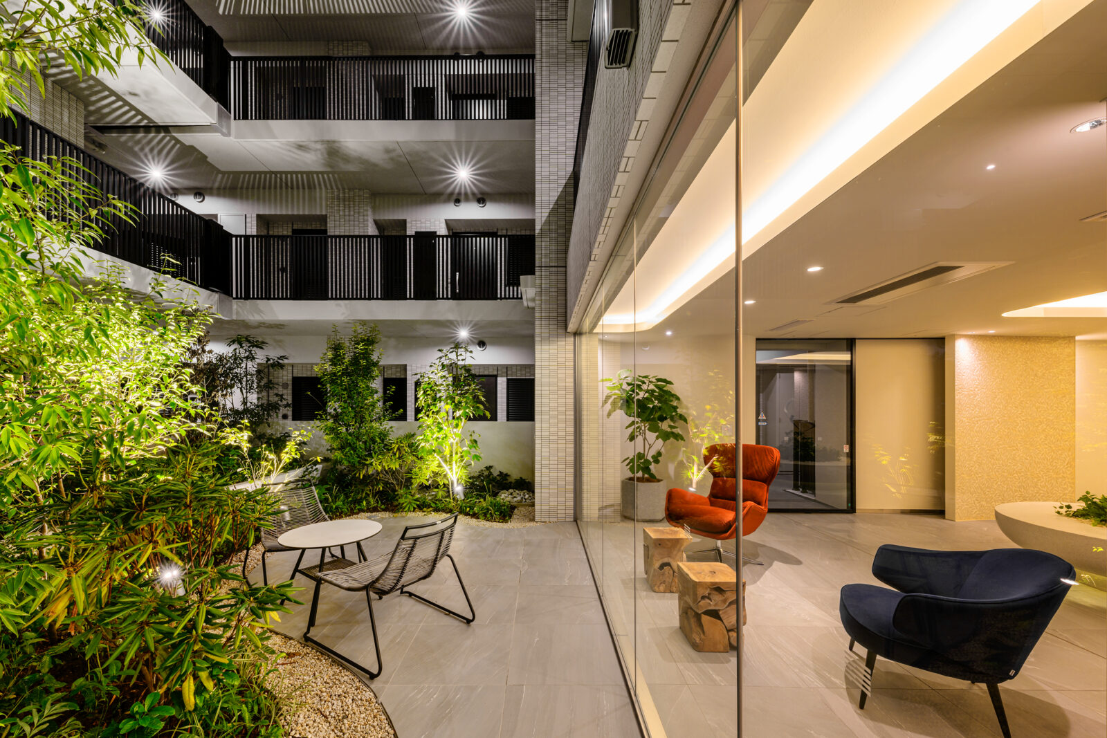 配棟は3棟構成となっており中庭を囲むことで、エントランスホール正面に緑が広がる内外一体となる空間を確保しています。
